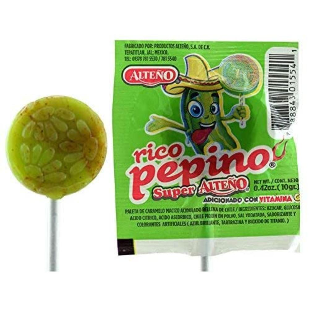 Hard candy cucumber lollipop with chili flavor.